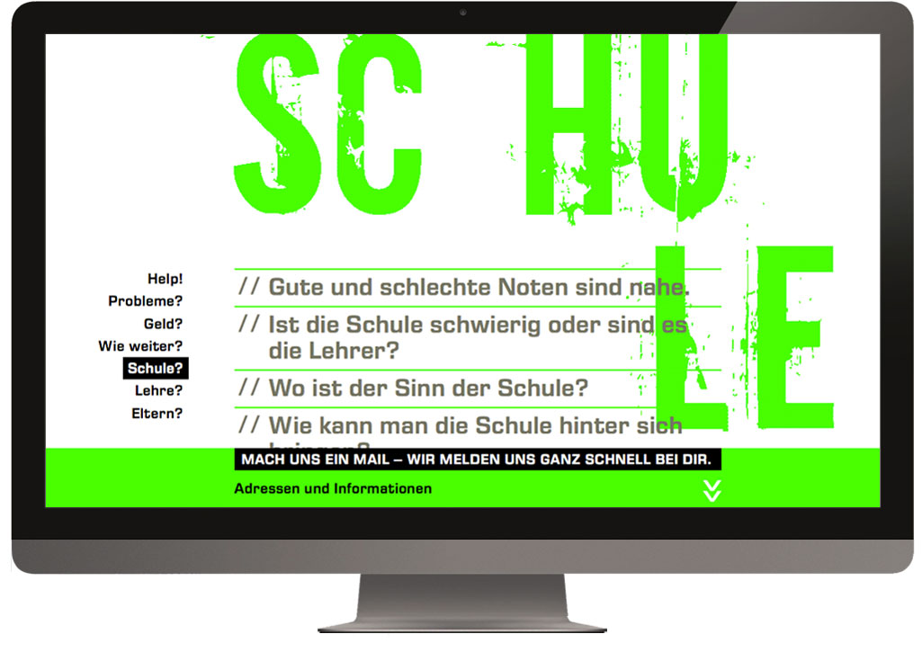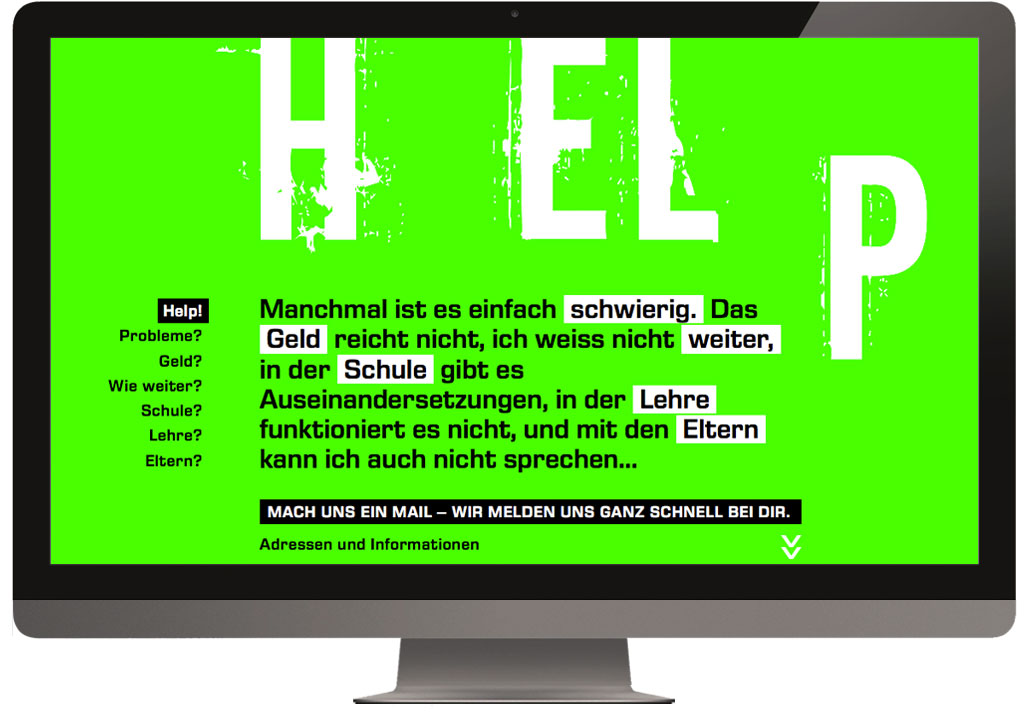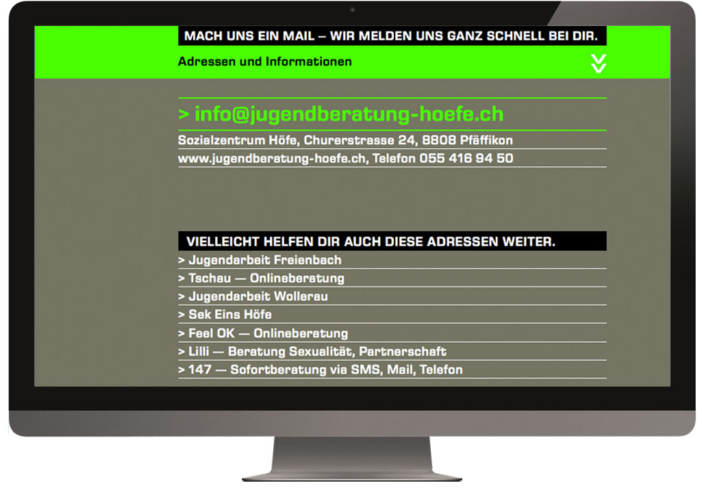 Für die Jugendberatung Höfe wurde der Webauftritt in Zusammenarbeit mit Quersicht :: Visuelle Gestaltung von Grund auf neu entwickelt. Zudem wurde eine Landingpage implementiert, welche als Einstiegsseite der Plakatwerbung zur Verfügung steht.