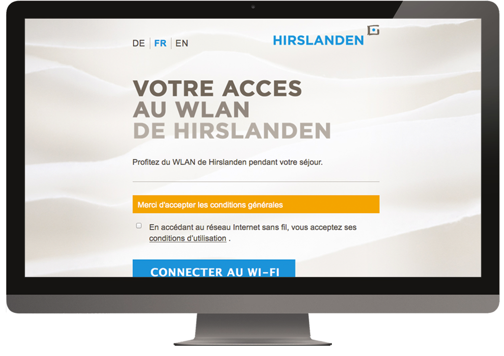 Um das kostenlose WLAN von Hirslanden zu nutzen, müssen die Nutzungsbedingungen akzeptiert und das Gerät (Smartphone, Tablet, Laptop) am internen System des entsprechenden Standorts von Hirslanden angemeldet werden. Dies erfolgt über eine Anmeldeseite, welche in Zusammenarbeit mit nood Graphic Design und Jonadesign entwickelt wurde. Die Seite wurde in reinem HTML5/CSS3 und Javascript umgesetzt und ist für den Besucher mehrsprachig verfügbar. Anhand der Browsersprache wird automatisch für den Besucher die bevorzugte Sprachwahl vorselektiert. Die Anmeldeseite ist optimiert für sämtliche Nutzungsgeräte.